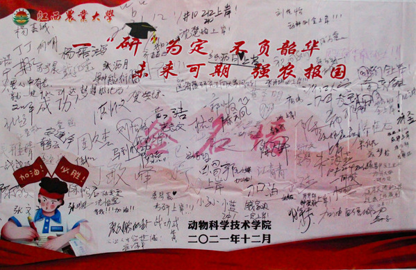 最后,考研学子在就业升学党小组精心准备的签名墙上郑重写下名字,作出承诺。学院老师们为考研学子送上礼物。考研学子纷纷表示,感谢学院的精心准备、加油鼓气,在动科院的四年里学有所成,考研也一定能取得佳绩。