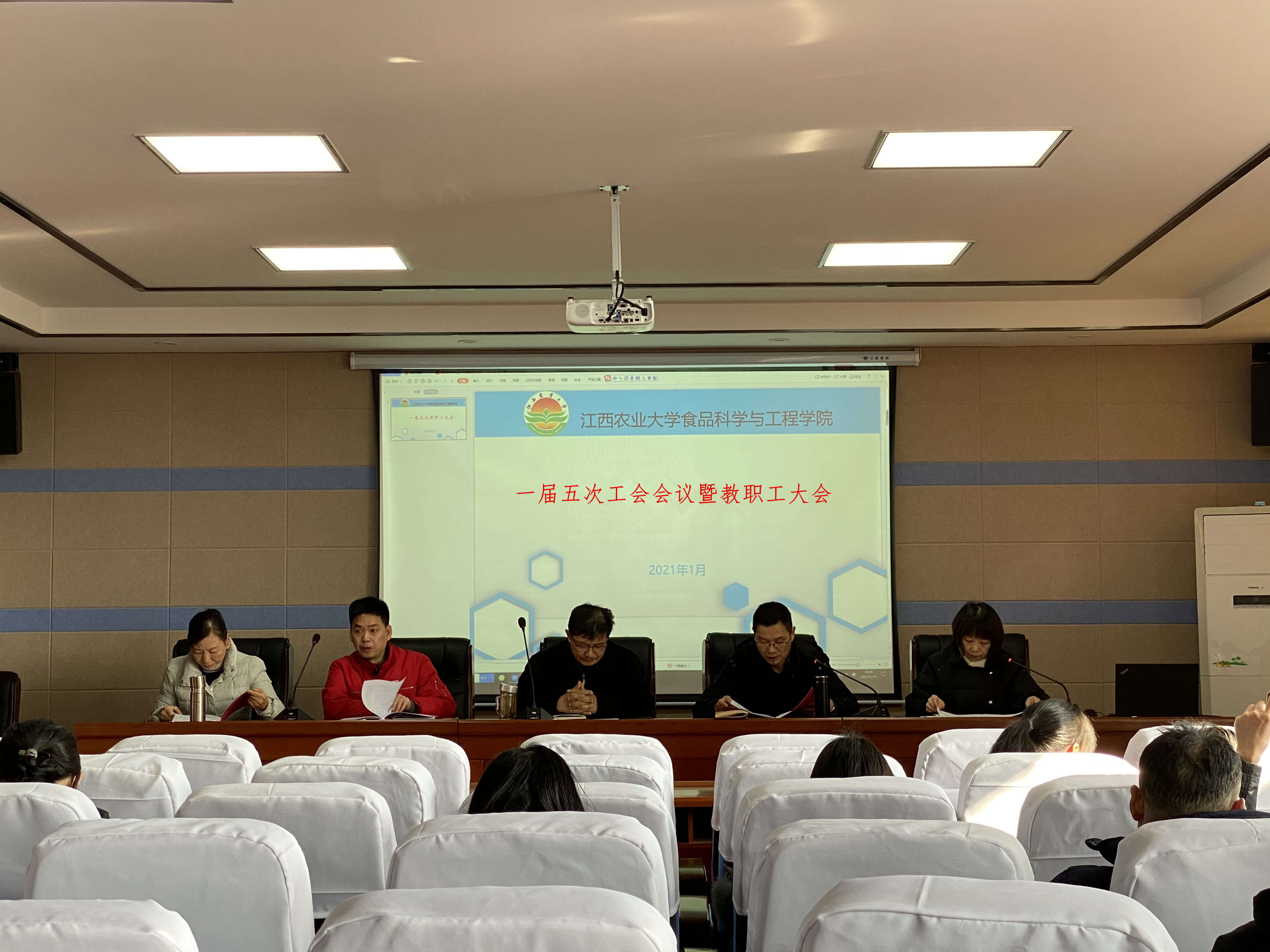 1月19日,食品学院在五楼报告厅召开一届五次工会会议暨教职工大会学院全体院领导出席,全体教职工参会。会议由院党委副书记胡丹主持。