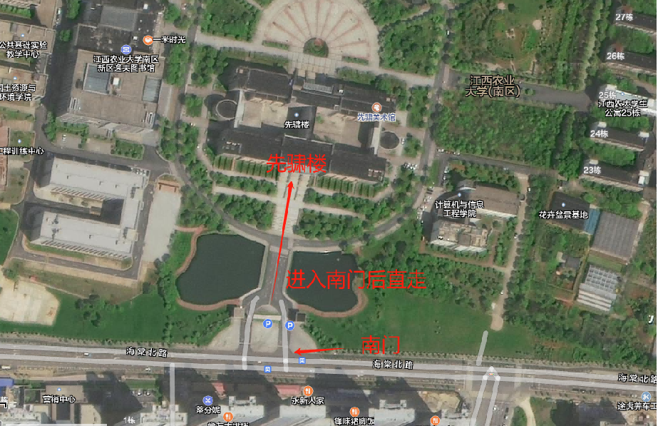 注:考生导航至“江西农业大学南区南门”,南门进入学校后面前第一栋教学楼即为“第五教学楼(先骕楼)”。