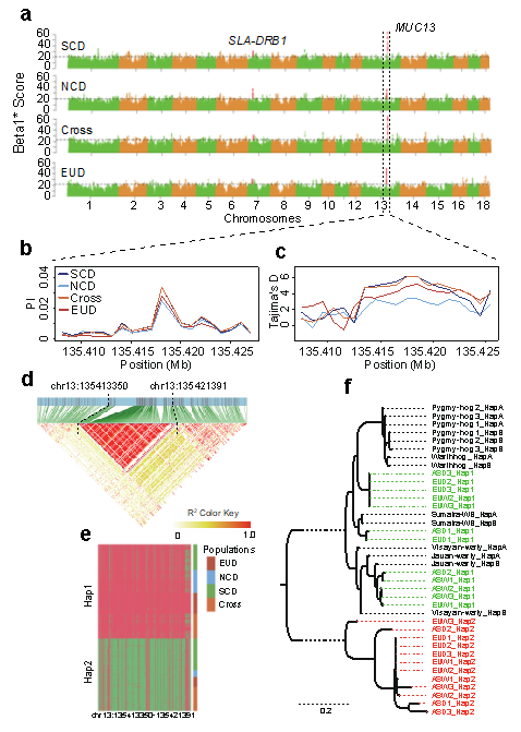 (3)挖掘了平衡选择和正选择的候选基因并阐明了其受选择区域影响的表型及潜在机理。多品种、大样本、高质量的猪参考单倍型库还是进化选择分析的重要参考。本项目在中国东南家猪、中国西北家猪、杂交猪和欧洲家猪的平衡选择分析中发现一个平衡选择基因MUC13,该基因在所有猪种中只存在两种单倍型。为了进一步解析该基因平衡选择的表型,项目利用前期构建的F2资源群体对300多项与生殖、肉质、血液、细胞、生长和免疫性状相关的表型进行扫描,结果发现MUC13的单倍型1个体表现为仔猪腹泻表型,而生长相关性状则显著增长,单倍型2个体表现为抗仔猪腹泻表型,但生长相关性状较单倍型1个体缓慢。该结果揭示了MUC13基因受平衡选择的潜在机理,提示广大动物育种工作者在育种过程中应科学选配受平衡选择的基因的个体。另一方面,由于研究中所涉及的猪种在体型上差异巨大,为了探究体型差异背后的遗传因素,作者针对猪体型大小进行了正向选择分析。结果鉴定到36个影响猪体型大小的候选基因,其中的6个已证实与畜禽体型大小相关。除此之外,作者还鉴定到一个影响体型大小的新候选基因NPR3,该基因不仅与人类身高和骨骼框架大小有关,还会导致小鼠骨骼的过度生长,是一个强候选基因,可为猪遗传育种提供重要借鉴。