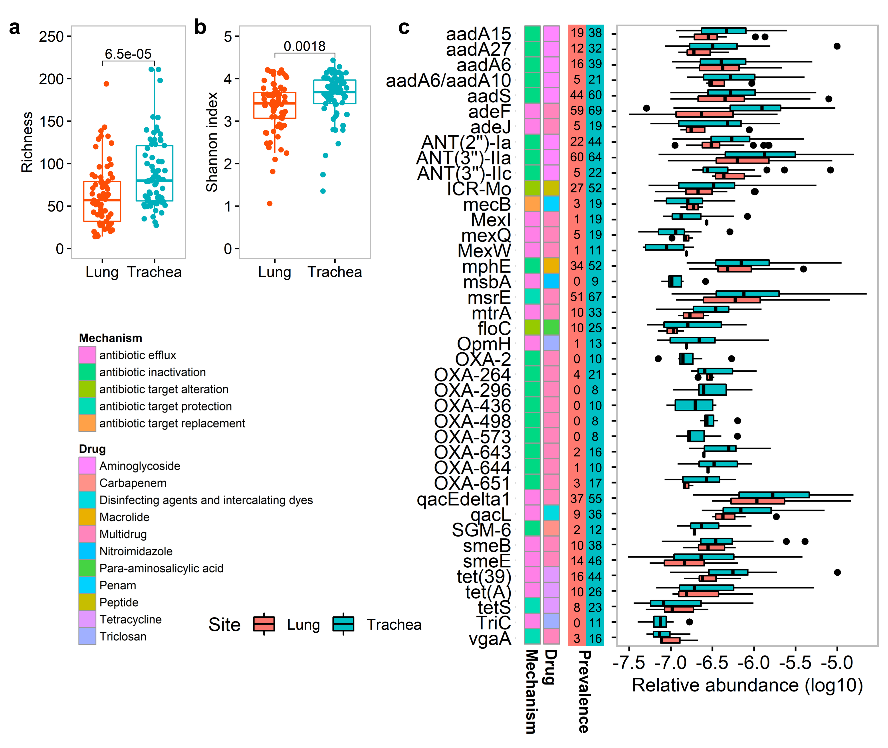 在613个精细测定了不同肺部病变程度(健康肺、轻度病变、中度病变和重度病变)个体中分析了抗生素抗性基因组成和丰度与肺部病变的关系,发现随着肺部病变程度增加,抗性基因组成的α多样性下降,进一步分析发现猪下呼吸道耐药组的组成主要由微生物群落的组成而不是肺部病变严重程度塑造。同时,还鉴别到73个抗性基因在不同病变程度猪肺中存在显著丰度差异。