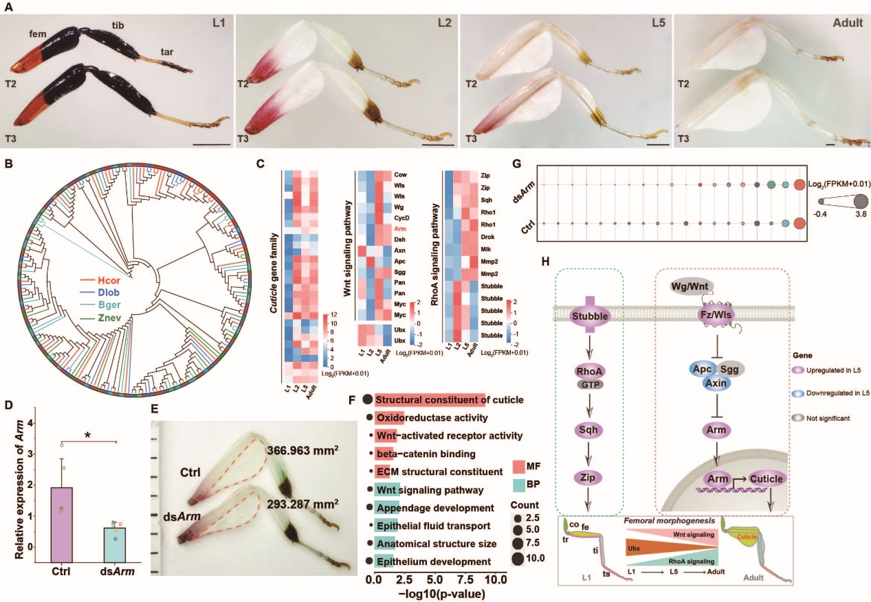 在该研究中,还对兰花螳螂股骨膨大的发生机制做了解析。组织学观察发现股骨膨大区主要是角质层,在兰花螳螂中角质层相关基因Cuticle发生显著扩张。不同发育阶段步肢组织转录组分析显示,Cuticle基因在2龄和5龄的腿部组织中表达明显高于1龄,与股骨膨大相关。结合转录组分析和RNA干扰实验证实了股骨膨大进一步受Wnt信号通路和Ubx调控。