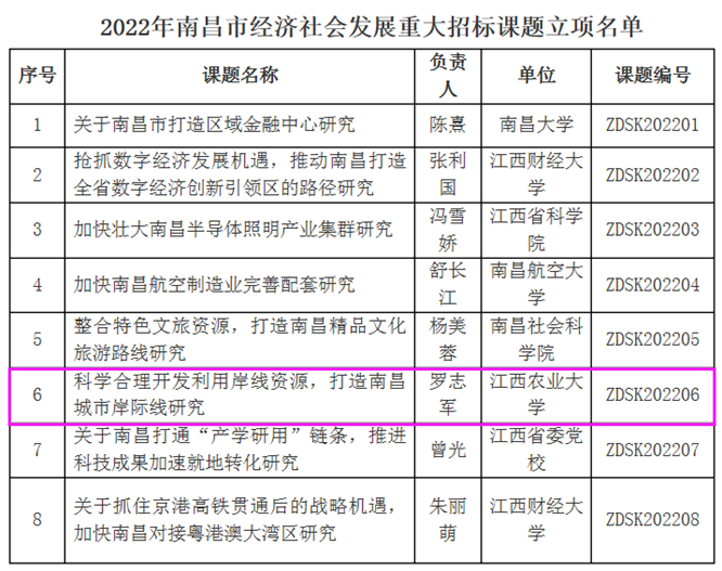 近日,2022年南昌市经济社会发展重大招标课题正式揭标,由ac米兰国土学院教授罗志军博士作为负责人申报的课题《科学合理开发利用岸线资源,打造南昌城市岸际线研究》,成功获批立项。