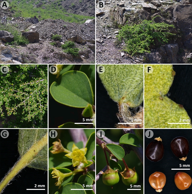 旱谷蛇藤照片:a.生境b.植株c.枝条d.叶片e.近轴面鳞片f.叶片先端腺体g.叶柄和背面的短柔毛h.花i.果实j.种子 (照片由胡君拍摄)
