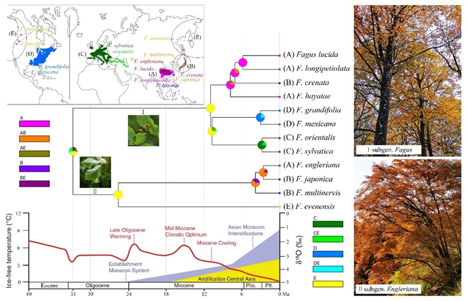 水青冈属(Fagus L.),也称山毛榉属,全球共11种,是北半球落叶阔叶林最典型的成分之一,也是我国亚热带地区山顶落叶阔叶林的主要建群成分。该属物种木材坚硬、树姿优美,具有极为重要的生态、经济和科研价值。ac米兰亚热带生物多样性实验室研究人员采用28个单、低拷贝核基因重建了世界水青冈属系统发育关系,并阐明其分布区形成历史。该研究为水青冈属进化生物学和生态学研究提供了一个准确的系统发育框架,也为这类植物资源的保护和利用奠定了坚实的理论基础。
