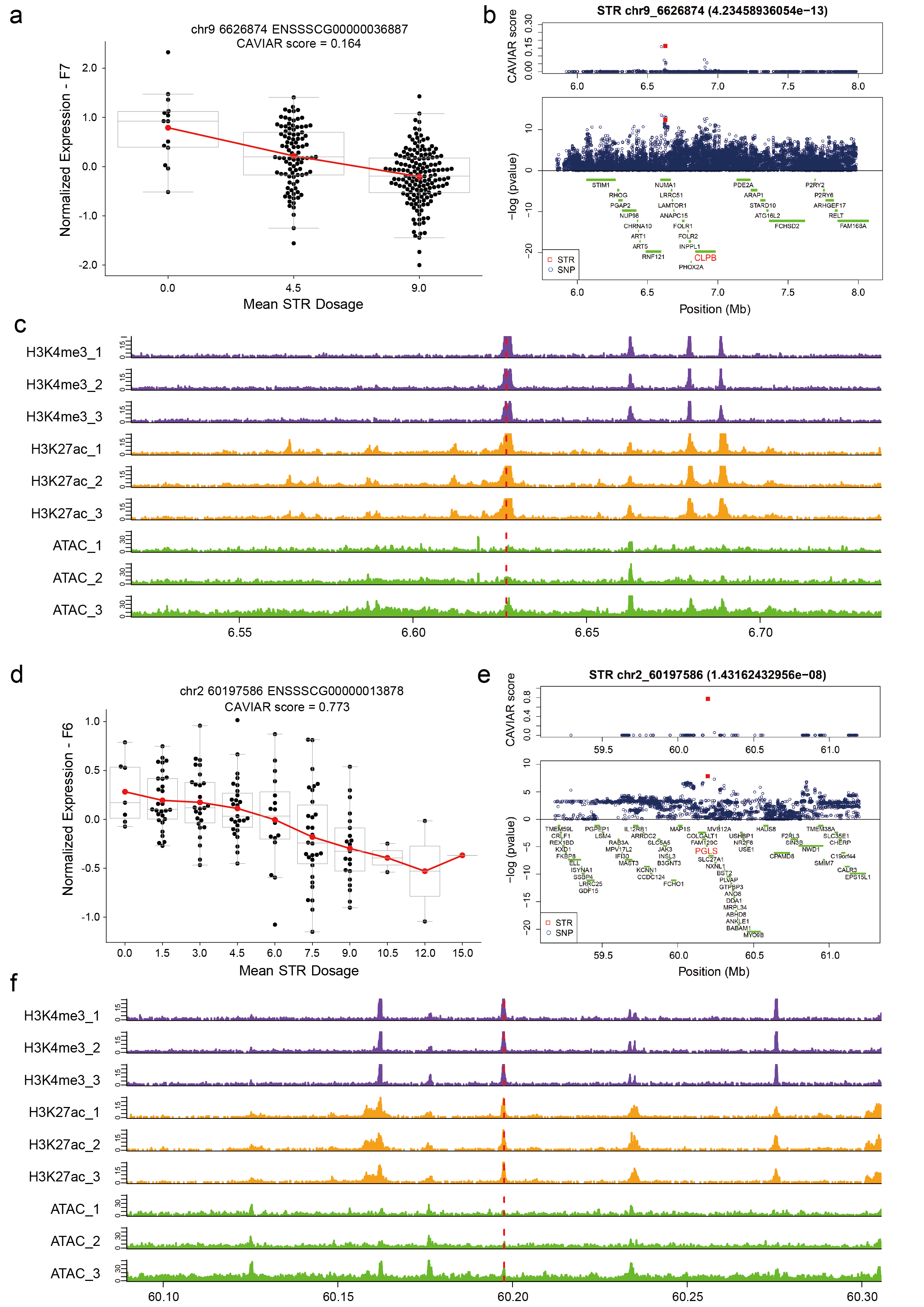 在另一项工作中,黄路生院士团队利用家猪嵌合家系群体F6(n=260)和F7(n=296)两个世代全基因组重测序数据和肝脏组织基因表达数据。在F6和F7群体中,分别鉴定了5,203和5,868个与基因表达显著相关的短片段串联重复(eSTR)。利用贝叶斯精细定位法,在F6和F7中分别确定了235和298个候选因果eSTR。并发现20个位于复杂经济性状关联SNP附近的候选因果eSTR与表观修饰序列重叠,并且其靶基因的功能与相关表型有联系。该研究证实基因组中的短片段串联重复序列能调控基因的表达,为家猪复杂性状的遗传改良提供了新型标记。相关研究成果以“Mapping short tandem repeats for liver gene expression traits helps prioritize potential causal variants for complex traits in pigs”为题于2022年1月17日在Journal of Animal Science and Biotechnology在线发表。黄路生院士、杨斌副研究员为文章的共同通讯作者,吴钟紫博士为第一作者。