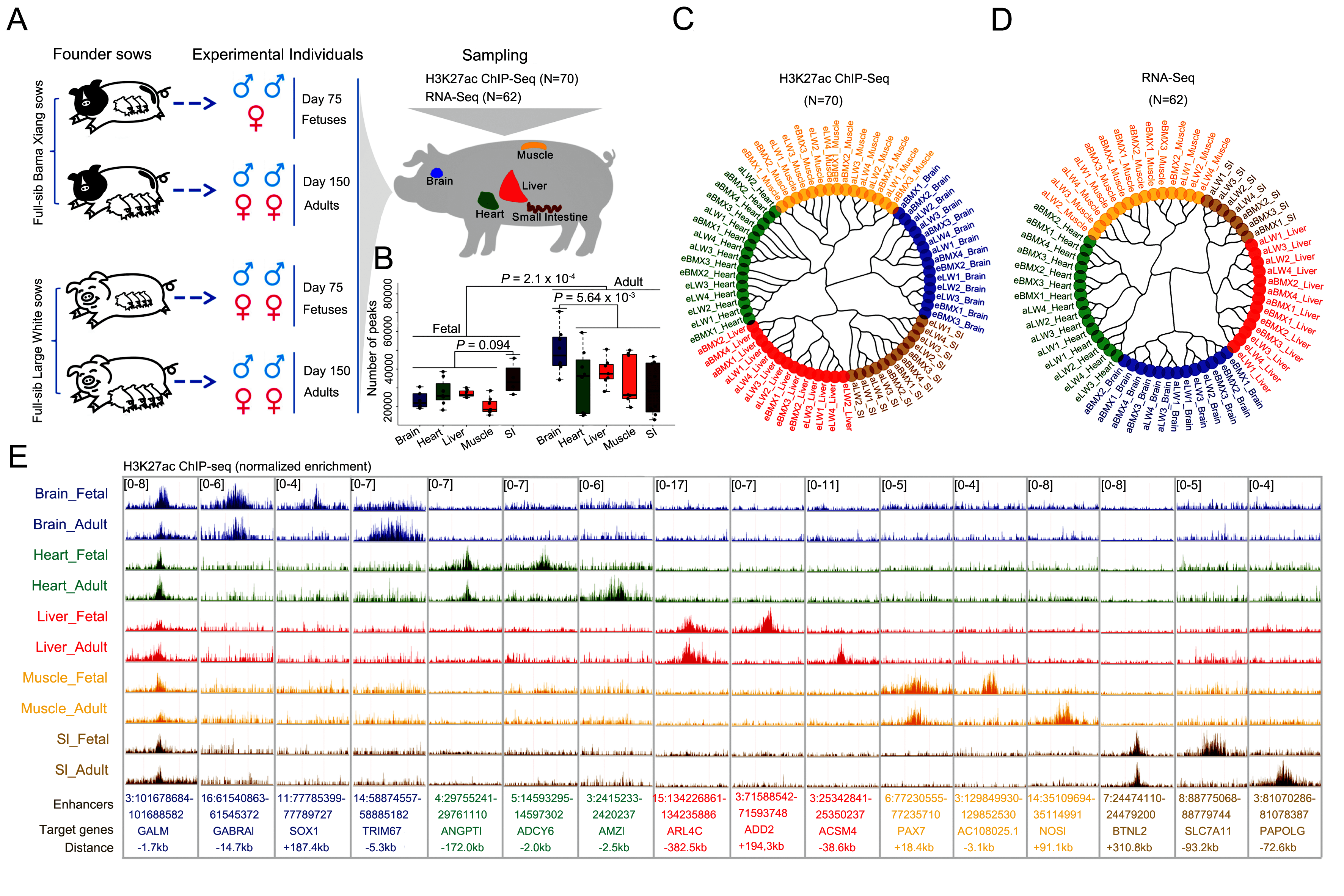 ac米兰猪遗传改良与养殖技术国家重点实验室黄路生院士团队在多时空多维度家猪启动子及增强子全基因组图谱构建的研究取得进展。研究团队利用H3K27ac ChIP-seq和RNA-seq等多组学技术系统地研究了来自不同发育胚层的多种组织(脑、肝、心脏、肌肉和小肠)、不同发育阶段(胚胎期75日龄和成年期150日龄)、不同品种(中国猪种巴马香和商业猪种大白)、不同性别(雌性和雄性)的101,290个活性增强子和启动子及其靶基因的功能及时空分布,揭示了这些调控序列在机体内发挥重要的生物学功能。鉴定到了110个在所有组织和发育阶段都稳定表达的安全港区域(safe harbours),为猪作为人类医学模型研究提供了有价值信息。发现 XIST基因启动子区域中的H3K27ac 和 DNA 甲基化可能与 X 染色体失活有关,丰富了人们对X染色体失活这一基础生物学过程背后基因表达调控的机制的了解。此外,团队在复杂性状相关基因以及突变位点的基因组区域中发现了相应的调控元件,为复杂性状的遗传解析提供了基础数据。相关研究成果以“Mapping and analysis of a spatiotemporal H3K27ac and gene expression spectrum in pigs”为题于2022年1月27日在Science China Life Sciences在线发表。黄路生院士、杨斌副研究员为文章的共同通讯作者,朱亚玲博士、周志敏博士、黄涛博士和张震博士为文章的共同第一作者。