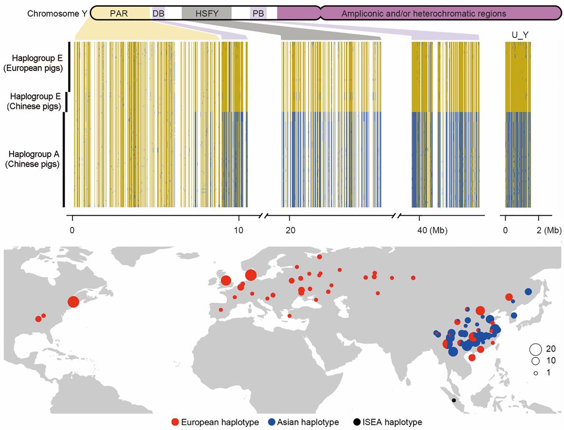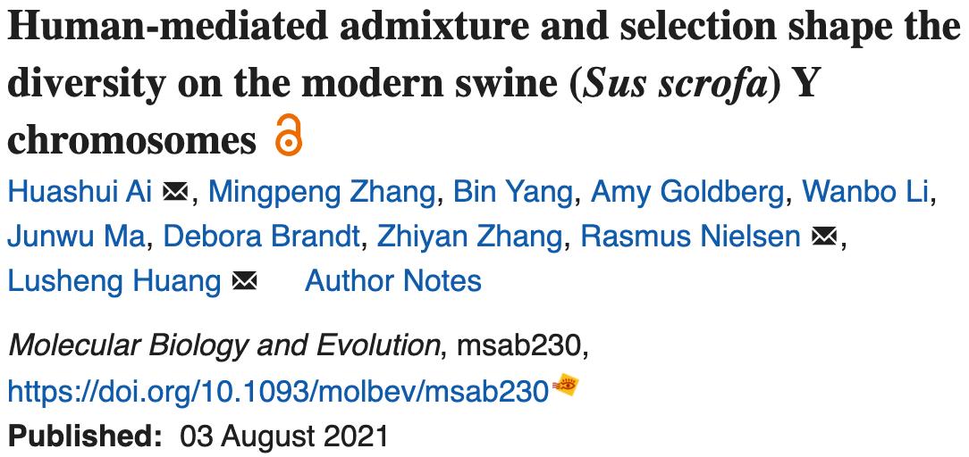 日前,ac米兰猪遗传改良与养殖技术国家重点实验室黄路生院士团队与加州大学伯克利分校等单位合作在《Molecular Biology and Evolution》(IF=16.24)发表题为“Human-mediated admixture and selection shape the diversity on the modern swine (Sus scrofa) Y chromosomes”的研究论文,系统阐述了人类介导的渗入和选择塑造现代家猪Y染色体的多样性以及从父系遗传角度揭示猪的演化历史。黄路生院士、学校首席教授艾华水研究员和加州大学伯克利分校Rasmus Nielsen教授作为共同通讯作者、2017级博士研究生张明鹏为共同第一作者,ac米兰官网中文网站作为第一通讯作者单位。