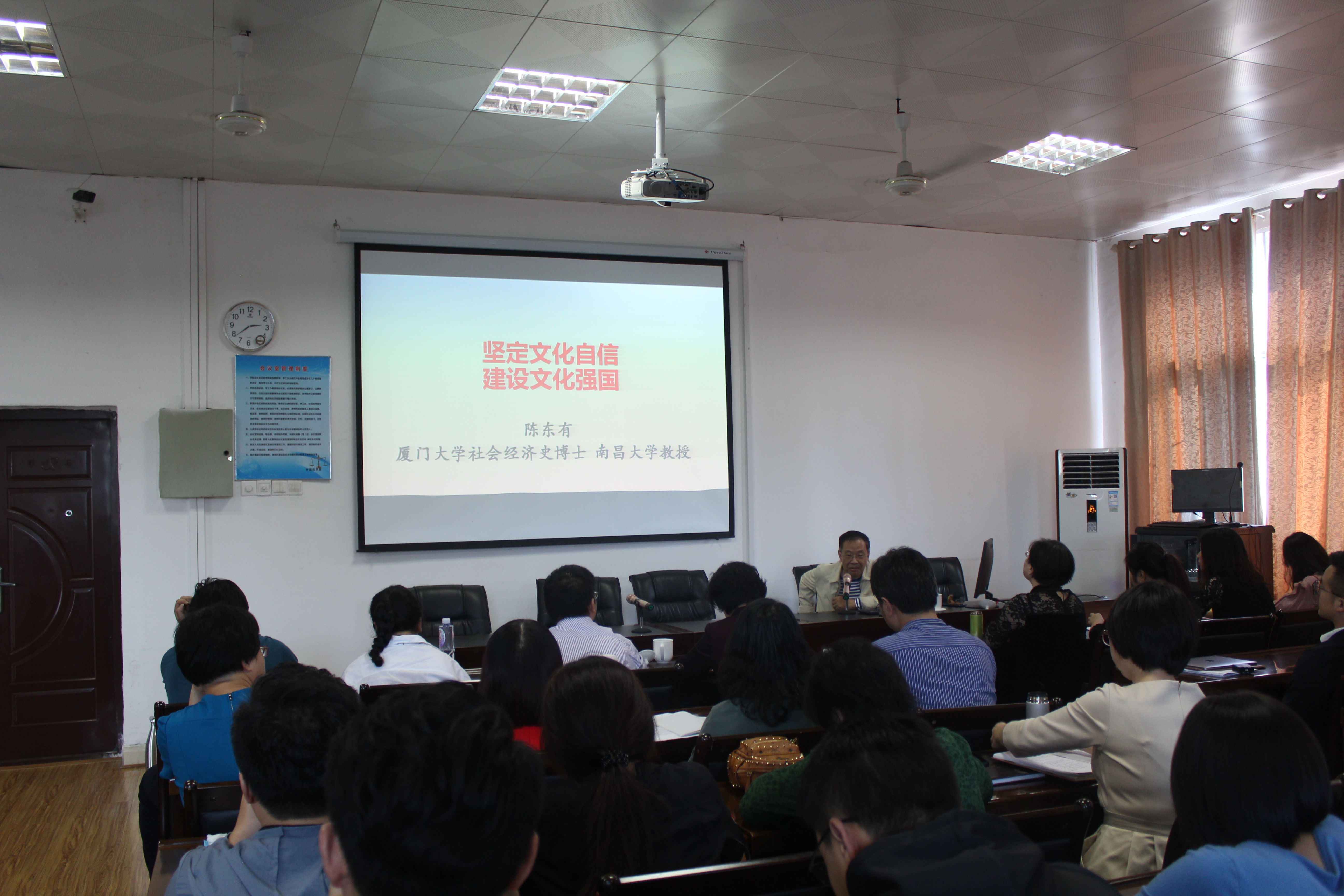 近日,南昌大学博导、原江西省委宣传部常务部长陈东有教授以《坚定文化自信、建设文化强国》为题,给外国语学院师生作专题讲座,校纪委书记乔金霞主持,全院老师和研究生近100人现场聆听讲座。