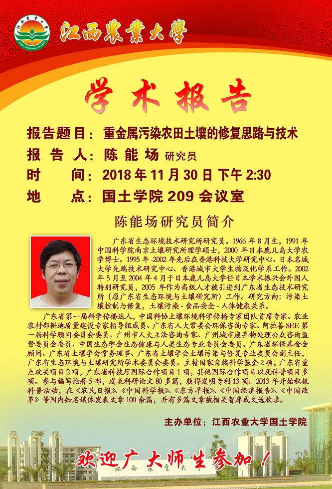 学术报告预告:重金属污染农田土壤的修复思路与技术