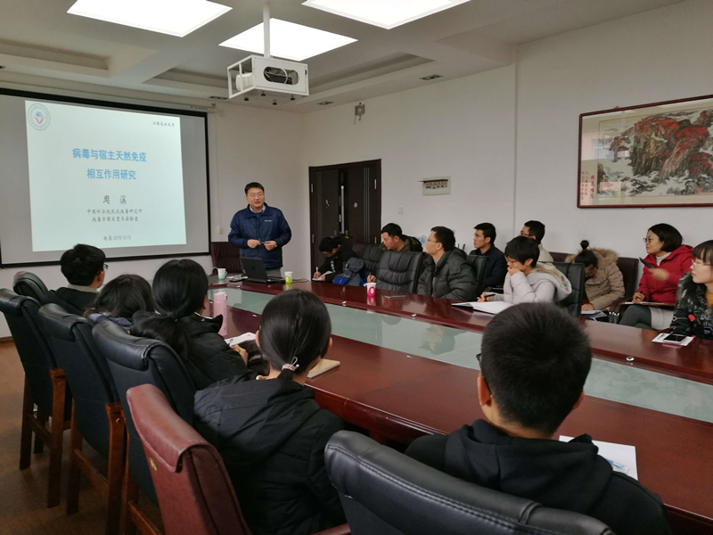 12月13日下午,中科院武汉病毒所病毒学国家重点实验室副主任、国家优青、863计划青年科学家周溪研究员应邀来校进行学术交流,为生工学院和动科院的师生做了题为《病毒与宿主天然免疫相互作用研究》的报告。报告由病原微生物研究所孔令保老师主持。