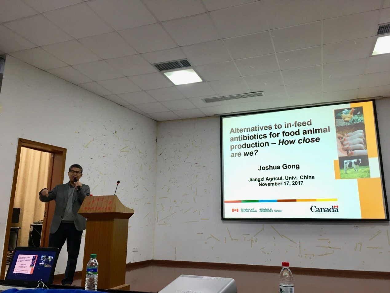 11月17日,应江西省动物营养重点实验室邀请,Johua Gong教授来ac米兰做学术交流并作学术报告。副校长黄英金会见了Johua Gong教授。动科院、食品院及动物营养重点实验室的师生代表参加了报告会,会议由江西省动物营养实验室主任瞿明仁教授主持。