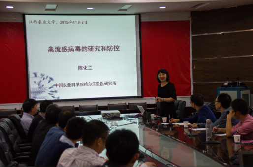 11月7日上午,国家杰出青年基金获得者、农业部动物流感重点开放实验室主任、中国农业科学院哈尔滨兽医研究所陈化兰研究员应邀来校作题为“禽流感病毒的研究与防控”的学术报告。报告会由副校长黄英金主持。