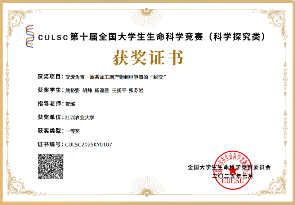 林学院/园林与艺术学院贺璐老师指导的林化2301班熊裕姿团队提交的《变废为宝——油茶加工副产物到电容器的蜕变》项目脱颖而出。该团队以油茶果壳为原料,创新采用芬顿预处理法结合氢氧化钾活化工艺,成功制备出电化学性能优异的超级电容器电极材料,为农业废弃物高值化利用提供了新思路。