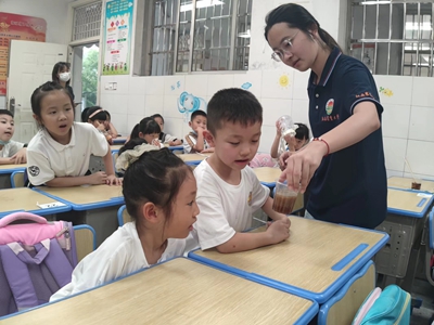 食品专业的大学生,走进上饶市信州区溪边村、月鹅小学,面向留守儿童,开展食品营养与安全知识宣传活动。在一个个有趣、直观的食品营养与安全小实验活动中,志愿者们为小朋友们讲解了食品添加剂的知识,在现场带领小朋友们做起了“饮料变水”“可乐沉淀”等实验。在实验中,小朋友们有的亲自动手、有的认真聆听和观察,沉浸在科学的魅力中。“我知道要少喝碳酸饮料了”“我下次喝可乐的时候只喝一点点,好好保护牙齿”“牛奶和可乐尽量不要一起喝”“老师”们向大家讲解实验原理后,小朋友们纷纷互相交流着自己的体会。