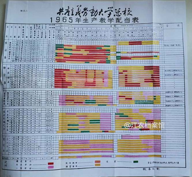 这张配当表,是由共大总校教务处制的,对农业系、林业系、畜牧兽医系、农业机械化系、农经系、马列主义教研室的7个专业49个班级的生产教学作了详细安排,时间从1965年2月7日至1966年1月29日,其中包括了短暂的寒暑假。配当表中用深红表示“专业劳动”,桃红表示“一般劳动”,玫红表示“现场教学”,桔黄表示“课堂教学”,绿色表示“实习”;同时还详细记载了部分班级现场教学与课堂教学的比例。