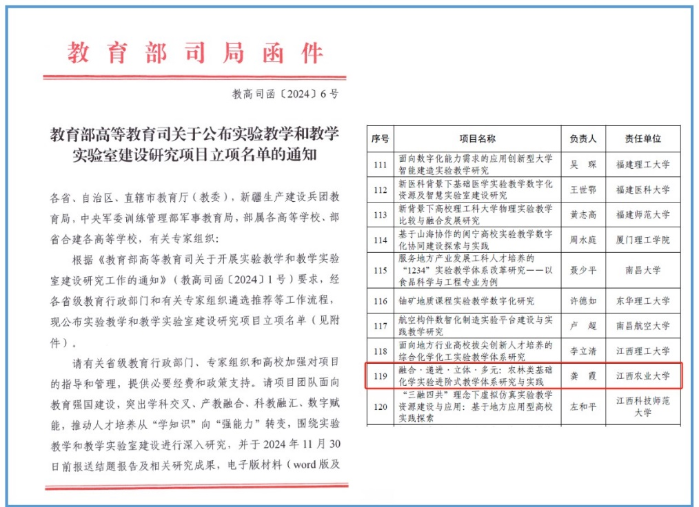 近日,教育部高等教育司公布“实验教学和教学实验室建设研究项目”立项名单,ac米兰龚霞教授团队申报的《融合·递进·立体·多元:农林类基础化学实验进阶式教学体系研究与实践》项目获批立项.