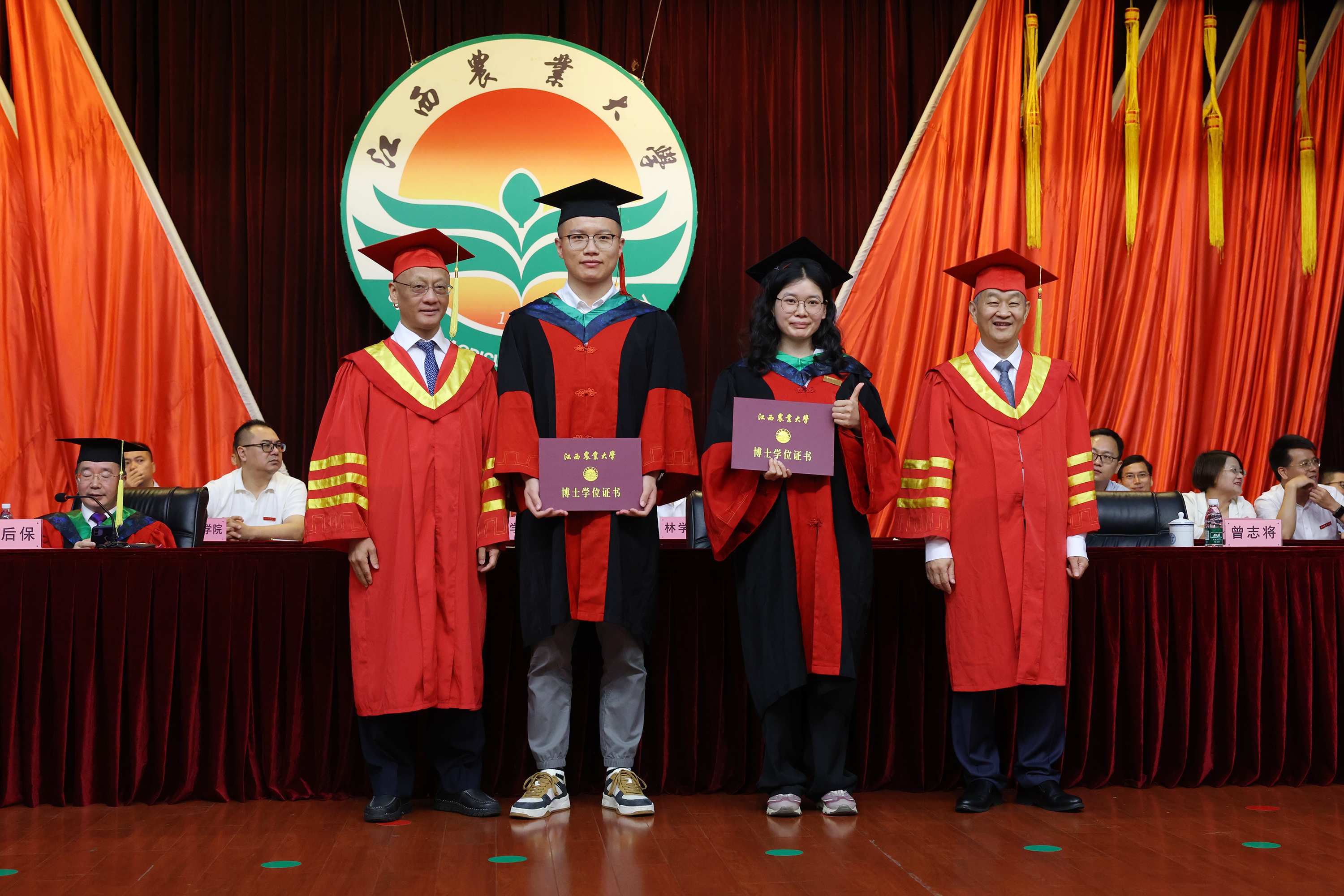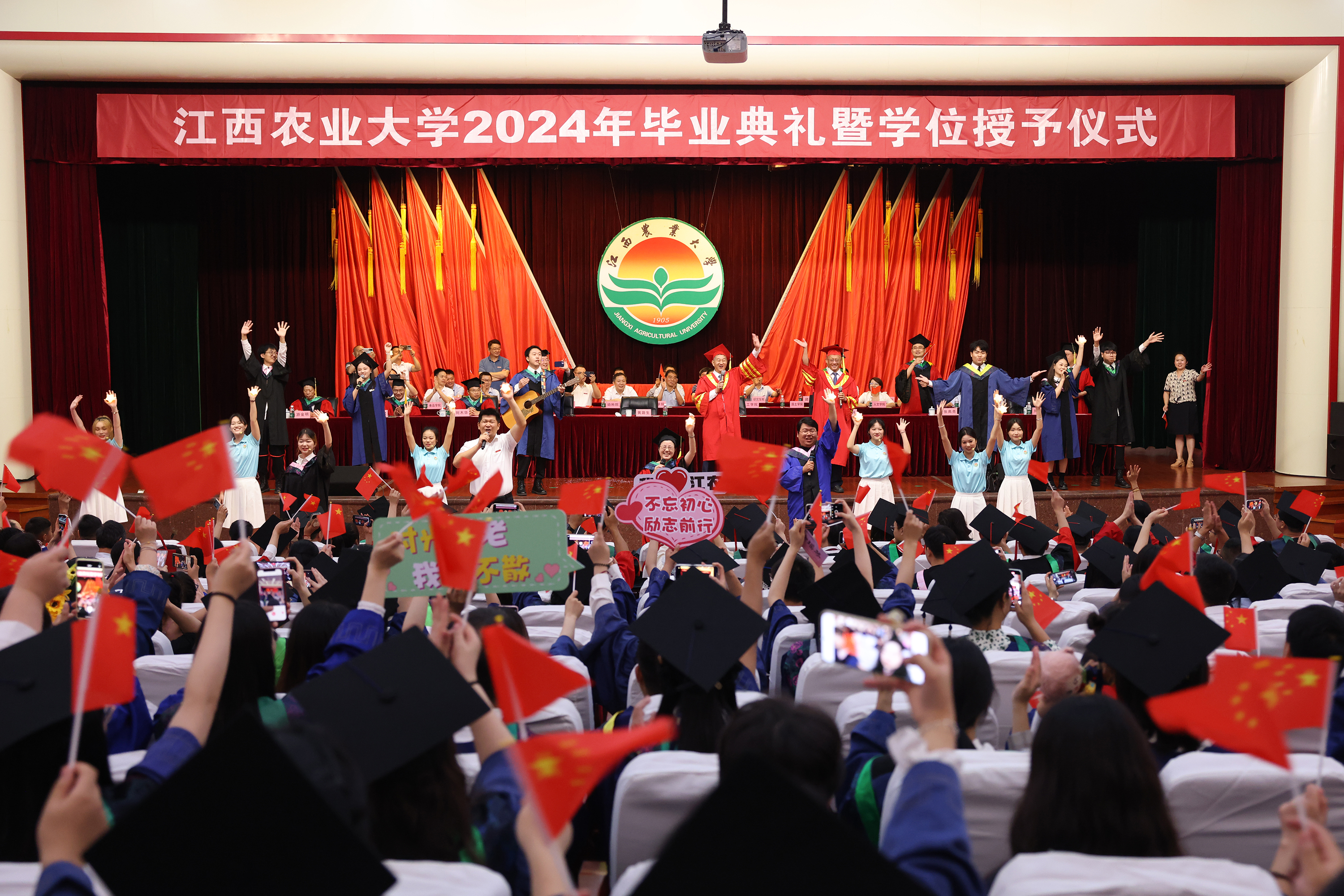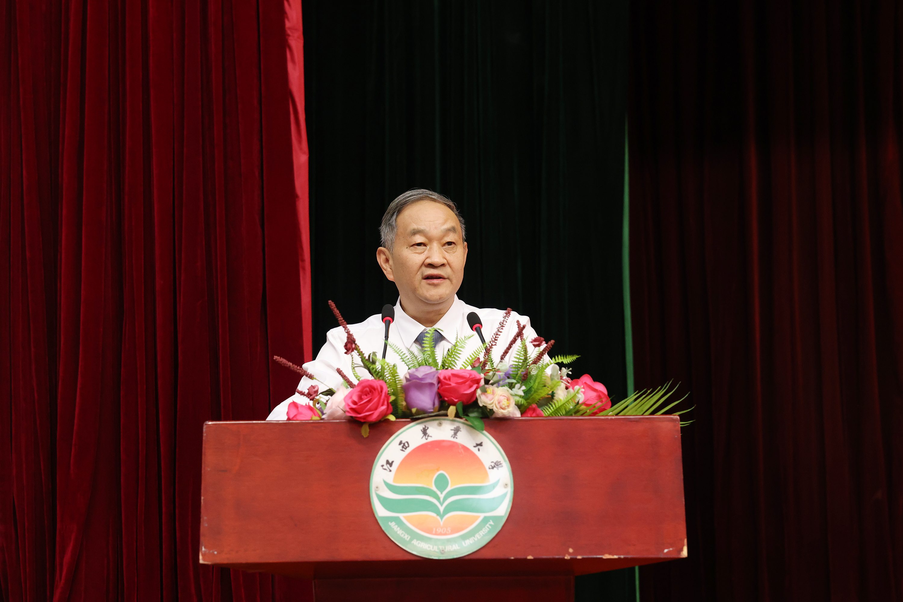 典礼在庄严的国歌声中拉开帷幕。校长魏辅文院士致辞,向全体毕业生表示热烈的祝贺,向辛勤培育毕业生的老师表示衷心的感谢!魏辅文指出,岁月如歌,我们相依相伴度过了难以忘怀的大学生涯;江农不语,见证了大家拼搏奋斗的青春风采,教室里钻研、实验室探索、图书馆苦读、体育场搏击,成为江农校园一道道靓丽的风景、百年学府一张张闪耀的名片。魏辅文以生态学名词“扩散”为主题,深情寄语毕业生们,一是扩散意味着扎根,要脚踏实地、知行合一,“立根原在破岩中”。希望大家都能传承和发扬“强农兴农”初心使命,在祖国和人民最需要的地方,克服各种困难,汲取“水分”、补充“养分”,努力向下扎根,积极向上生长。二是扩散意味着成长,要坚持不懈、永不放弃,“弃落荒坡依旧发”。希望大家走出校门后,能够积极适应新环境,正确面对挫折与困难,只有历经化茧成蝶的痛苦,才会感受到展翅高飞的快乐。三是扩散意味着绽放,要挺膺担当、奋斗不止,“随风轻舞逸天涯”。希望大家在实践中练就一身真本领,掌握一门好功夫,在平凡岗位上干出不平凡的业绩。