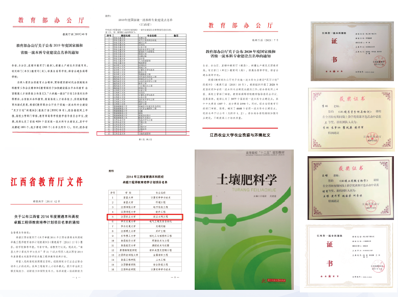 国土学院整合教学与科研资源,构筑学科平台,凝练学科方向,围绕农业资源高效利用和生态环境保护的国家重大需求,立足地处典型红壤地区、建设国家生态文明试验区及鄱阳湖生态经济区等的资源与环境特点,系统开展了红壤资源利用改良、耕地质量建设、土壤遥感与信息、作物养分高效利用和施肥决策、污染土壤修复及治理等研究与应用。2019年土地资源管理专业、2020年农业资源与环境专业获批国家一流本科专业建设点,2023年新增资源与环境专硕点。农业水利工程专业获教育部卓越农林人才培养计划试点专业,2023年环境与生态学首次进入ESI全球排名前1%。同时学院以创建“金专”、“金课”、“金师”为教学发展目标,全面推进高校课程建设,发挥好课堂教学育人作用。《环境监测》、《土壤学》、《中国典型土壤的矿物鉴定虚拟仿真实验》、《土壤肥料学》、《GIS软件操作技术》等课程获批江西省一流本科课程。赵小敏教授的省级教学成果一等奖《传承卓越•创新实践•引领成长—一懂两爱三有四得‛农科类专业人才培养的探索与实践》《基于“三三三”模式的农科类专业大学生实践教学体系创新与实践》为农科类专业人才培养提供宝贵的指导意见。