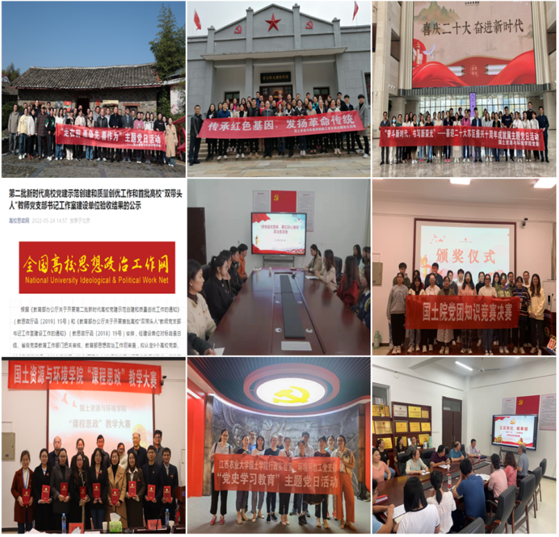 国土资源与环境学院党委坚持以习近平新时代中国特色社会主义思想为指导,加强党的组织建设,全面落实“一岗双责”和第一责任人职责,绷紧党政融合工作链条,全面推进党建三化建设,打造具有学院特色的“一体两翼”金扁担党建新品牌,推动“党建+内涵”建设。2019年思源党支部顺利入选教育部第二批新时代高校党建示范创建和质量创优工作“全国党建工作样板支部”,并于2022年完成验收。红色走读作品获全省高校党史故事比赛一等奖,“四色育人”构建学生社团党建模式项目获全省“争创第一等党务工作”党务技能大赛“学校、公立医院和科研院所等事业单位党建工作”项目二等奖,1人获评江西省优秀党务工作者。