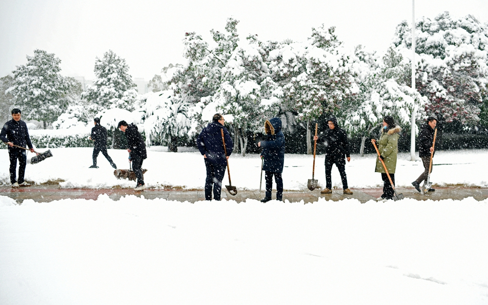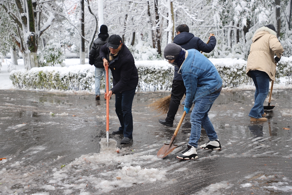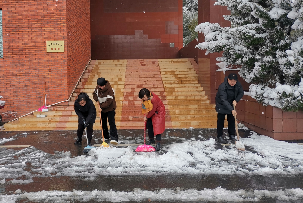 师生们冒着严寒、迎着飞雪,手拿铁锹、扫把等清理工具,齐心协力、通力合作,在办公楼、实验楼、商业街等区域,清理出一条条方便、安全的通道,充分展示了师生积极向上、勇于担当的精神面貌,以实际行动为冬日的校园增添一份温暖。
