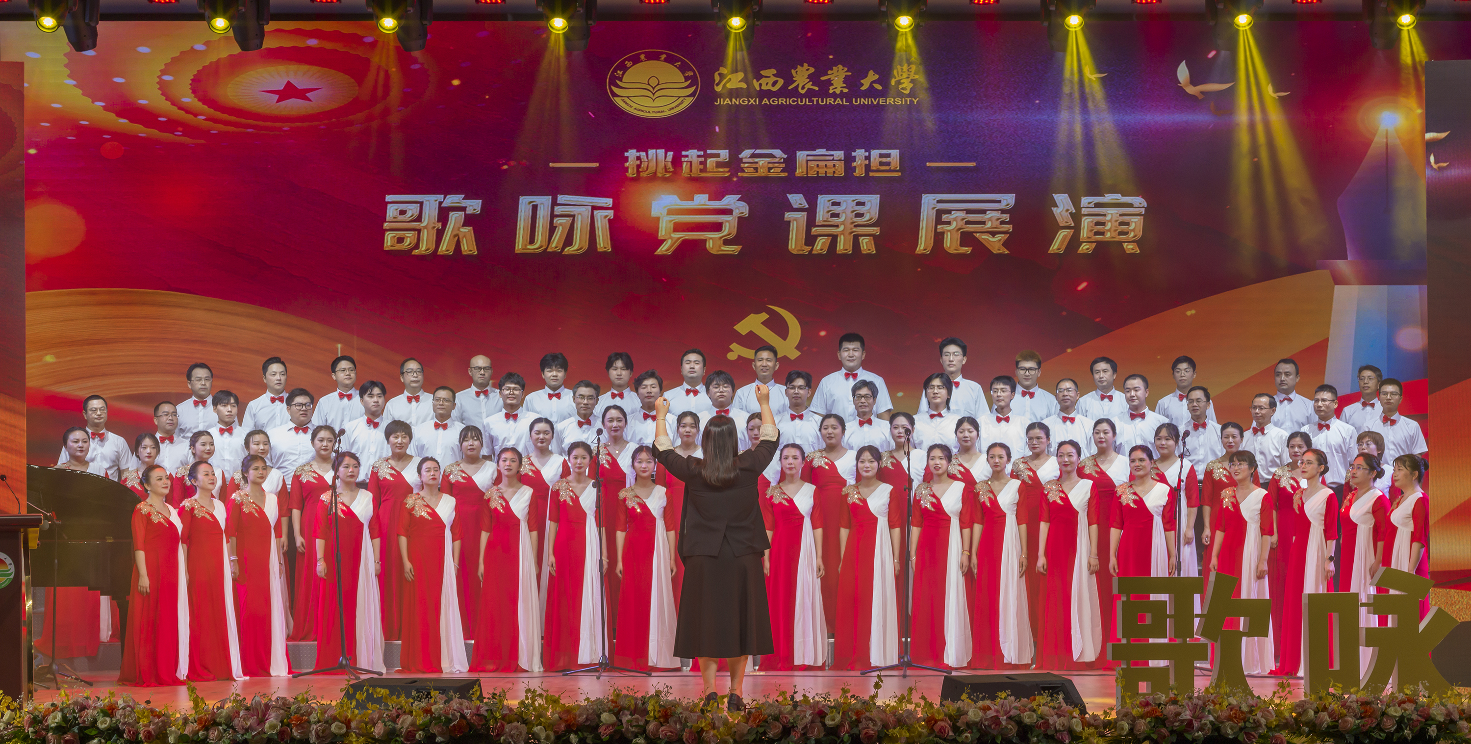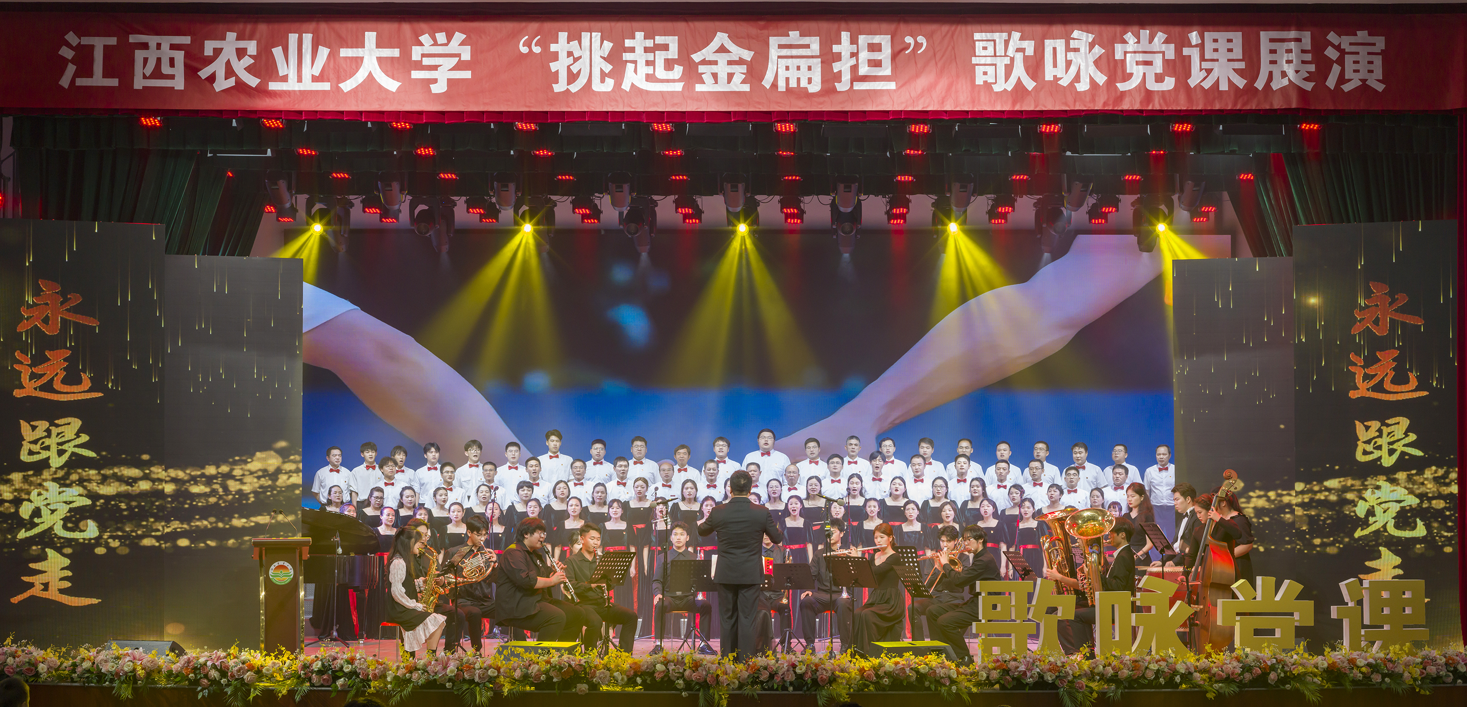 以歌为形,颂党、颂国、颂人民;以课为体,讲理、讲法、讲故事!6月13日晚,校大礼堂座无虚席、歌声掌声不断,“挑起金扁担——歌咏党课”展演活动这里隆重举行,17个二级党委以党课讲述党的百年辉煌,以歌声祝福伟大的中国共产党。校领导蔡海生、贺浩华、曾志将、刘木华、张高亮、王文君作为机关党委代表登台演唱,省委第十巡回指导组成员、1000余名师生共同观看展演。