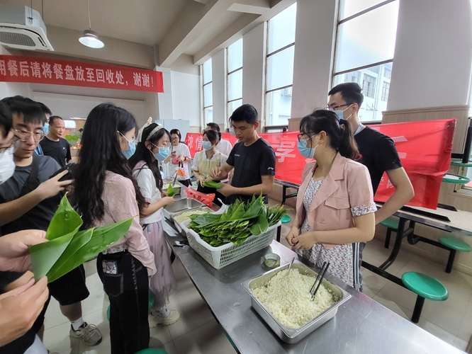 在学生第三食堂组织包粽子比赛中,无论参与的是学生还是教职工,都全身心投入比赛当中,粽叶、糯米和蜜枣很快被包成了一个个小巧玲珑、形态各异的粽子。在动手过程中,师生们感受到了浓浓的节日氛围。