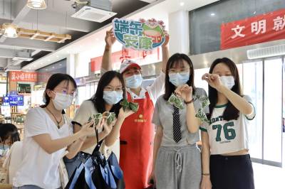 “将粽叶旋转,在三分之一处重叠平放在手心”,计信院辅导员陈蕾耐心给同学讲解包粽子的步骤,6月3日,学院举办了“浓情端午,粽香计信”包粽子活动。同学们在老师的指导下,互相交流包粽子的技巧,尽情体验着亲手包粽子的快乐,度过别样端午节。“包粽子活动让我们在学校也有了在家过节的感觉,和大家在一起非常开心。”大数据2104班曾新富说道。软件学院在食堂举办“浓情端午,粽享欢乐”活动,学院老师向同学们传受包粽子的技巧方法,向大家讲解端午节的由来、习俗以及历史起源,让现场学子更加了解端午节的民俗知识和文化。