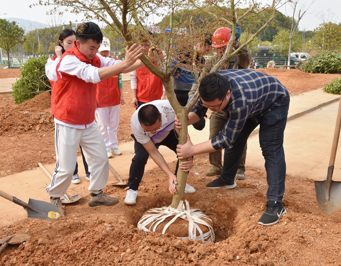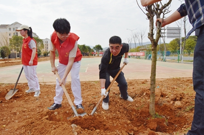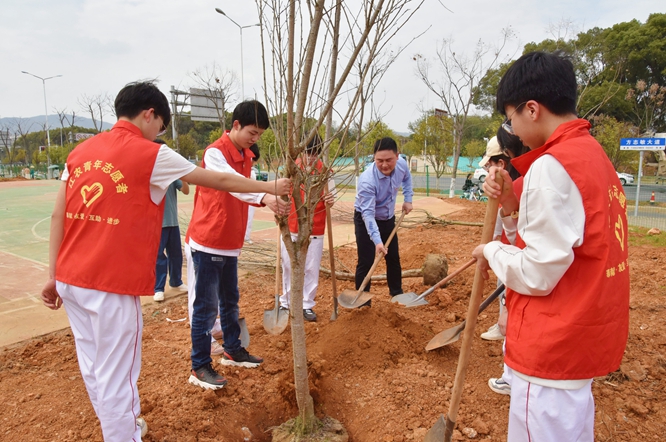 校领导带领师生协作配合,手持铁锹,从挖坑栽苗、培土浇水,每一道工序都认真完成,大家一边植树,一边了解树木品种的相关知识。通过共同努力,累计栽下了香樟、樱花、桂花、茶花等70余株。整个植树活动现场呈现一片热火朝天的劳动景象,大家挥汗如雨,看着种下的树苗,都露出开心的笑容。植树节期间,学校还开展了校园“补绿添彩”、班级团支部认养树苗、植物讲堂等丰富多彩的活动。