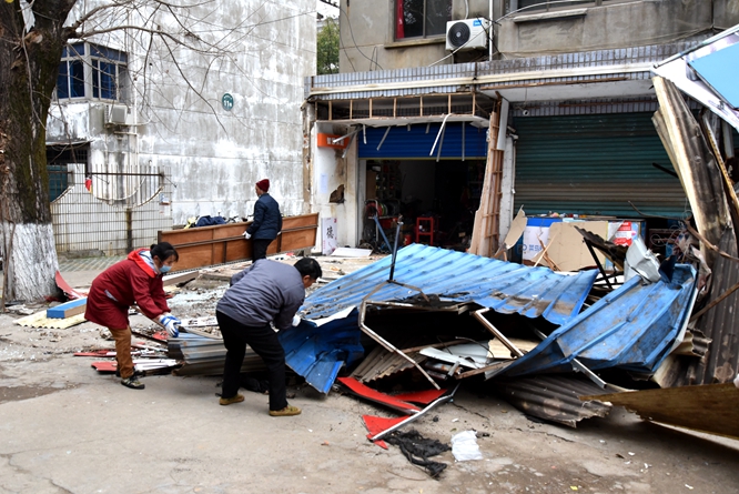 打造整洁、有序、健康的环境是文明校园创建的重要内容。1月14日,学校正式启动校园“拆违拆临”行动,整治长期存在的商铺出店经营“乱”象。在属地政府的配合下,对厚德路沿线42家商铺的违章建筑物依法进行集中拆除。