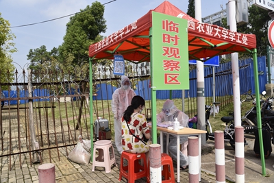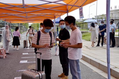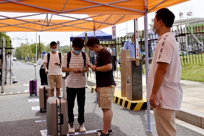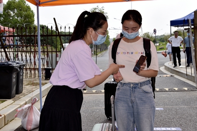 本次演练现场模拟了返校当天入校、住宿流程。在学生入校的卡点现场,相关工作人员演练了行李消杀、检测体温、扫码检查等入校流程。在学生宿舍区,进行了间隔1米、体温检测、微信小程序扫码验证身份、楼栋志愿者做防范提醒,核实学生信息等流程演练。其中,特别针对体温异常、个人健康码异常、没有核酸检测证明、没有接种新冠病毒疫苗、午检发现体温异常、接疾控部门信息发现密切接触者等几种返校报到异常进行演练,进一步提高学生返校疫情防控的应急处置力。