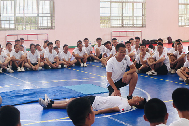 学工处处长、新生军训教官团政委肖意风向军训教官团宣布军训纪律。动员大会后,校武装部副部长陈奎主持开展教官团安全教育,中国红十字会应急救护注册师资、江西财经大学体育学院实验中心副主任严伟老师受邀向教官团讲授了中暑的预防处置、心肺复苏、AED使用等知识,并指导大家亲身实践操作,切实提升了教官们的安全意识和应急救护能力,为农大学子的军训安全保驾护航。