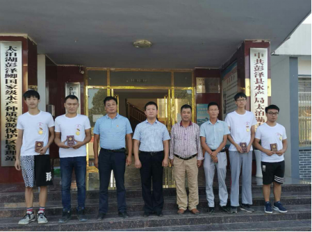 日前,在太泊湖(中湖)防汛指挥部,彭泽县公安局政委吕善诚、彭泽县科协党组书记吴义满代表彭泽县委、县政府,给来自ac米兰官网中文网站动物科学技术学院水产养殖1801班的袁农、巫德勇和钟俊城等3名同学颁发防汛奖章和纪念品,对他们不畏险阻参与一线抗洪表示充分肯定和高度赞扬。
