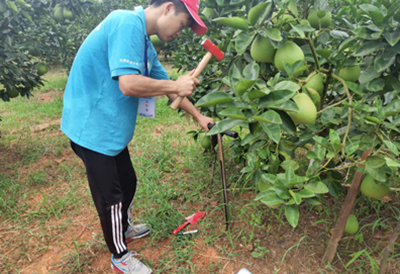 实践队员吴强建的主要工作是对蜜柚种植园区的土壤进行采样,烈日时分,他正挥舞着铁锤铁铲,对果园的土壤进行取样。他介绍道,大家挣分秒地工作,主要是想对采集的土样及时保存冷冻,尽快寄回学校,便于后期检测分析土壤样品,以分析检测结果来判断当地的土壤条件是否适合种植蜜柚,并提出改进土壤条件的具体对策。