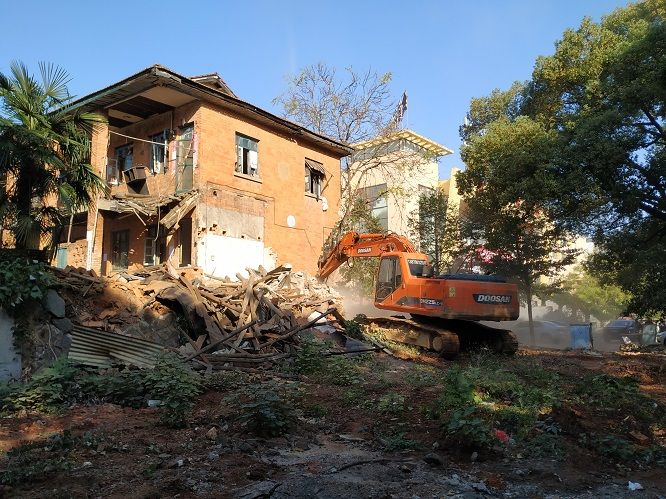 老9栋位于继续教育学院和教工食堂旁,建于50年代,2007年被确定为D级危旧房屋,存在较大安全隐患。学校党政高度重视校园危旧房拆除工作,校党委书记黄路生、校长赵小敏多次对动迁和拆除工作提出明确要求。11月19日,学校住房领导小组召开专题会议部署拆除工作,校领导胡春晓、许斌华、林小凡要求,各部门要凝聚共识、分工合作、落实责任,确保拆除现场安全、平稳、有序。后勤、基建、保卫等部门迅速落实,定期巡查、组织拆除施工队伍、制定安保方案。相关部门精诚合作、准备充分,经过现场破土、推房、降尘、除杂、清理等环节,拆除工作井然有序、平稳顺利。