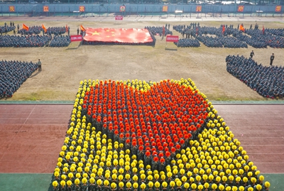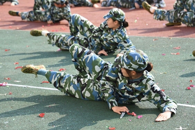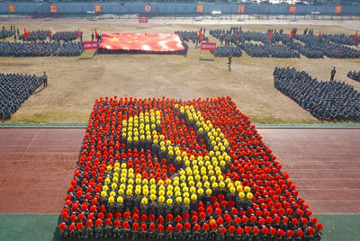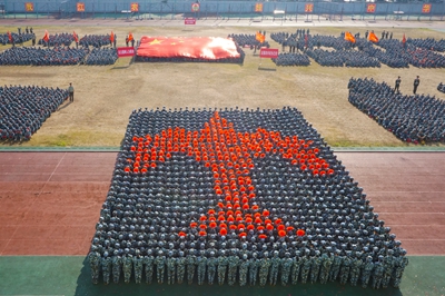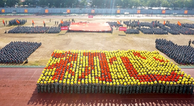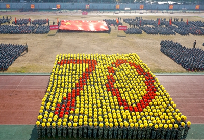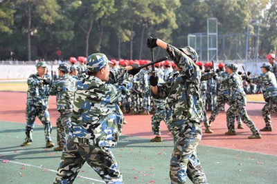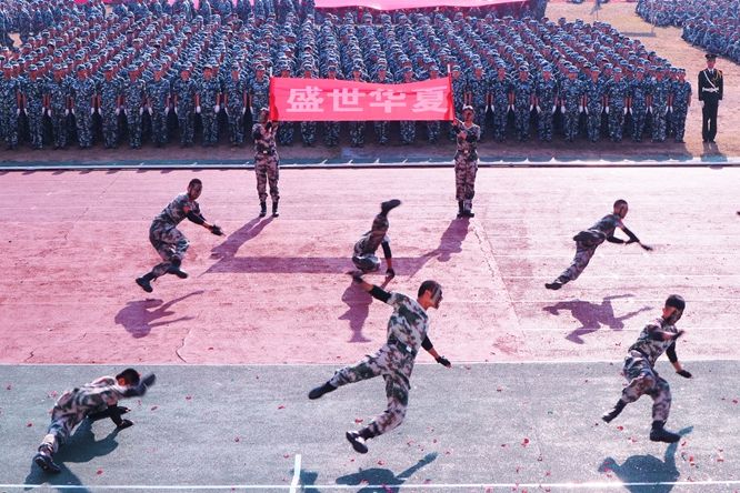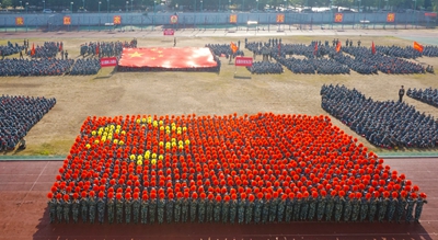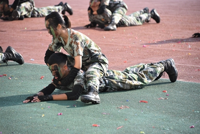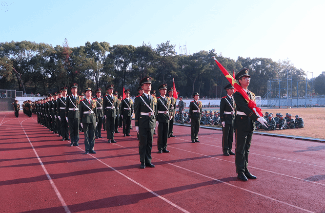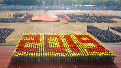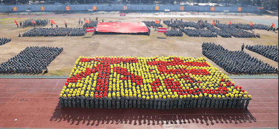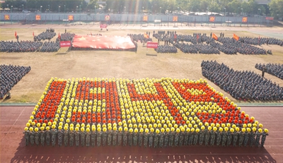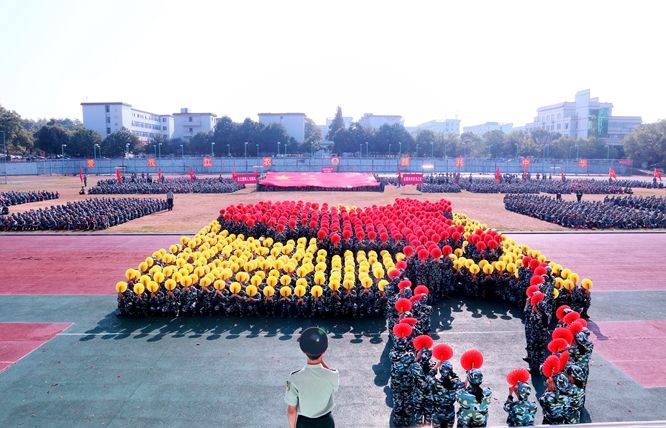 展演连队开始军体拳、刺杀操、盾棍术及队形的演练,同学们斗志高昂,配合默契,出拳虎虎生威,踢腿凌厉有力,精彩的展示赢得现场师生的阵阵掌声。各方阵变换队形,依次摆出了“1949——2019”“70”“不忘初心、牢记使命”等字样和国旗等图案,实力表白伟大祖国。
