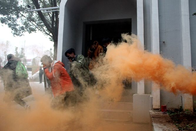 消防教育演练活动由消防安全应急疏散演练、灭火器使用方法讲解和灭火演练、消防水带实操演练等三个环节组成。消防安全应急疏散演练环节在17栋学生公寓虚拟火场,随着烟雾弹点燃,顿时浓烟四起,警报响起。工作人员发现火情后立即启动应急机制,迅速组织参演学生从各个安全通道疏散;消防官兵接到报警后迅速赶赴现场对被围困人员进行救援,待人员全部疏散完毕,打开水带、连接消防车的水箱,快速喷射水柱,模拟灭火。随后,消防官兵向参演学生详细讲解灭火器使用方法和扑灭火灾的技巧,以及消防水带实操步骤。参演学生在专业人员的指导下,亲身体验灭火器的实际操作和消防水带的演练。整个演练活动在紧张有序的氛围中顺利完成。