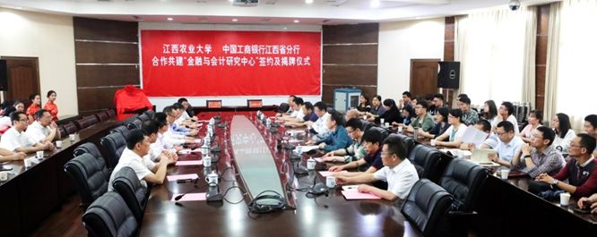 副校长黄英金与中国工商银行股份有限公司江西省分行副行长张毅分别代表合作共建方为协议签约;校长赵小敏与中国工商银行股份有限公司江西省分行党委书记、行长陈汀共同为“金融与会计研究中心”揭牌。