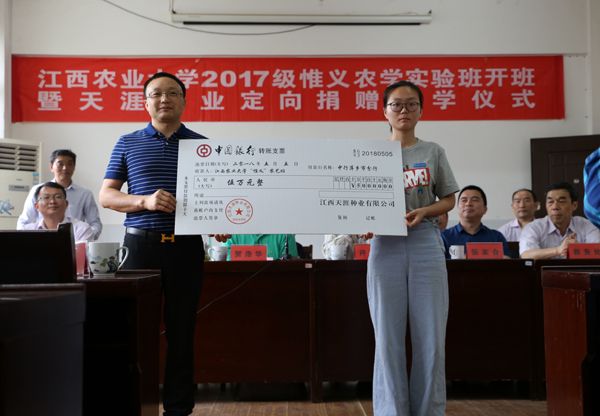 仪式上,江西天涯种业有限公司向2017级“惟义农学实验班”定向捐赠助学金人民币5万元。