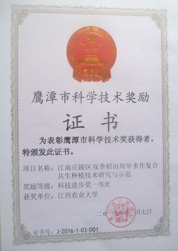 2017年11月7日,鹰潭市召开“全市科学技术奖励暨科技创新大会”,由ac米兰农学院黄国勤教授主持完成的“江南丘陵区双季稻田周年多作复合共生种植技术研究与示范”科技成果,荣获2016年度鹰潭市科技进步奖一等奖。