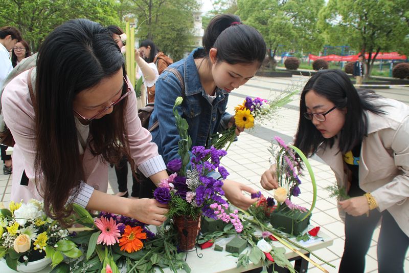 活动共吸引全校130余名选手以及部分兄弟高校学生参加,大赛包括鲜花插花、丝网花插花、手捧花插花三类比赛项目和植物微景观造景展示项目。参赛选手充分发挥艺术想象力,巧妙运用鲜花、枯树枝、藤蔓、苔藓、树叶等,搭配出各种颇具创意的作品。在经过两个多小时的自由插花后,一件件艺术佳作在选手们的手中诞生,现场俨然成为花的海洋。最终经过专家评审,《高躅》、《草长莺飞》和《花好月圆》获得鲜花插花类一等奖,《追梦的幽蓝君子》获得丝网花插花类一等奖,《盛放的青春》获得手捧花插花类一等奖。