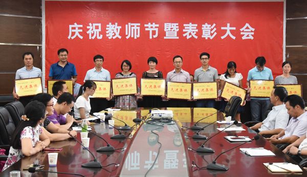 为庆祝第32个教师节,进一步营造尊师重教氛围,9月9日下午,学校在校办二楼会议厅召开庆祝教师节暨表彰大会。校领导黄路生、陈金印、赵小敏、贺浩华、许斌华、黄英金,校长助理邱晓辉出席,并为先进集体、先进个人代表颁奖。各单位负责人、2013至2016学年“三育人”先进集体代表和先进个人、学生代表参加。校党委副书记陈金印主持大会。