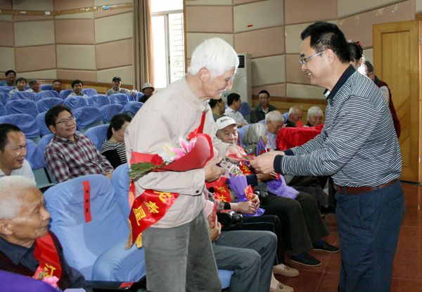 会上,学生礼仪队首先向今年80周岁的老寿星们敬献了鲜花。校党委书记曹国庆亲自为老寿星献上贺礼,祝福老寿星们身体健康、笑口常开、生活幸福。