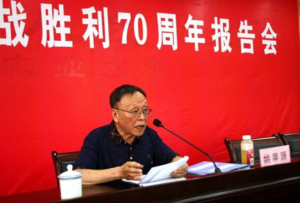9月1日,学校在校办公楼报告厅举办纪念抗战胜利70周年报告会。学校邀请原中正大学教授、“抗战捐躯教授第一人”姚名达烈士之子姚果源先生来校作报告。校领导曹国庆、陈金印、许斌华亲切会见姚果源先生。