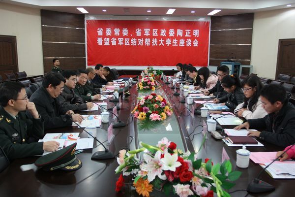 听取完同学们的发言,得知10位同学一年来的成长和进步,陶正明将军非常高兴和欣慰。他鼓励同学们,困难就是人生的磨刀石,只要经得起磨砺,人生前途会越来越光明。大学生是国家的希望,民族的未来。我们的军队国防要实现现代化,国家要实现富强,最需要的就是人才,就是大学生的培养。陶正明将军希望同学们坚定地朝着自己的理想和目标奋斗,刻苦学习、努力实践、不断提高社会适应能力,做一个有思想、有知识、有力量的人,在报效国家、服务社会上争取更大作为。陶正明将军表示,省军区将一如既往的实施帮扶政策,对同学们的帮扶将“一帮到底”。最后,陶正明将军祝愿同学们学习进步,健康成长,祝愿江西农大培养出更多高素质人才。