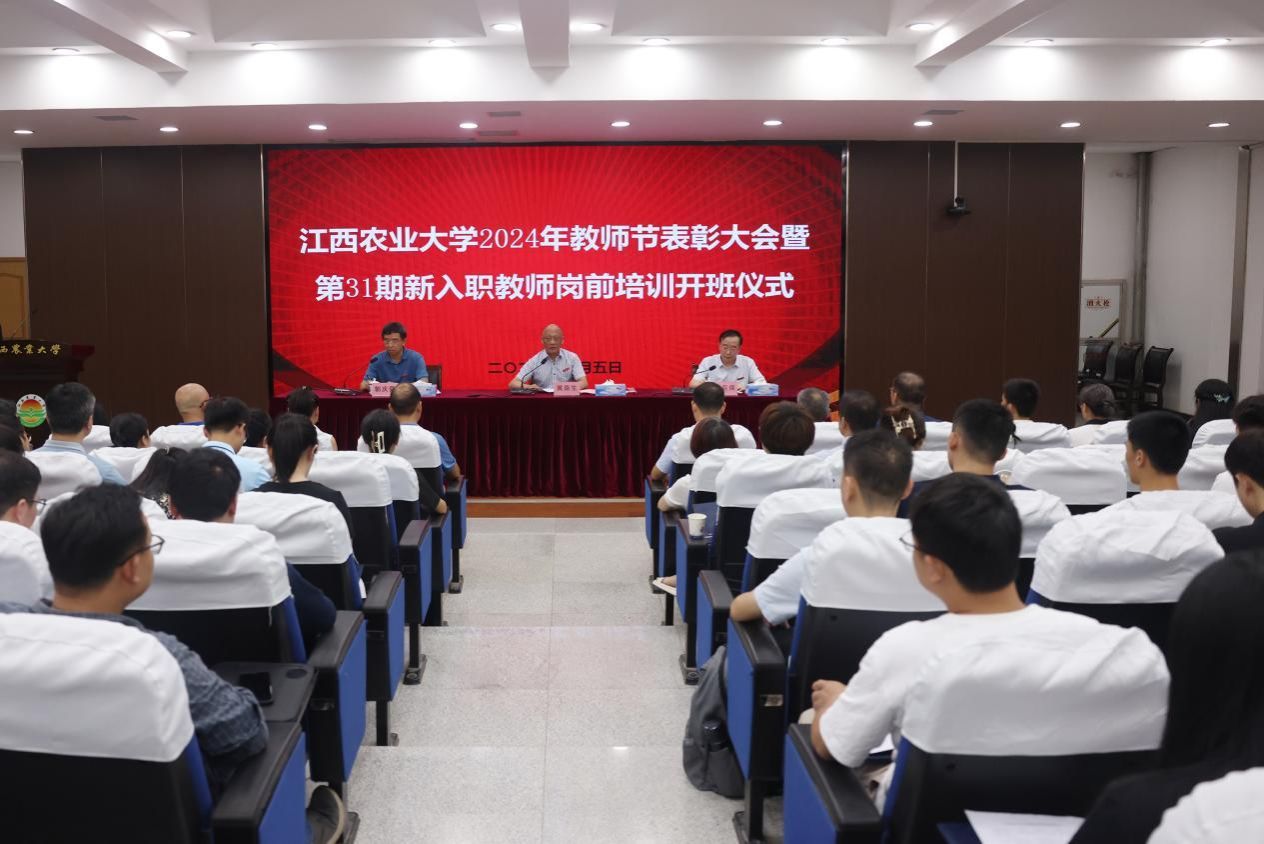 9月5日上午,ac米兰在校行政楼一楼报告厅隆重举行2024年教师节表彰大会暨第31期教师入职培训开班仪式。校领导、相关职能部门及各教学单位负责人、优秀教师代表、全体新入职教师参加大会。大会由副校长樊后保主持。