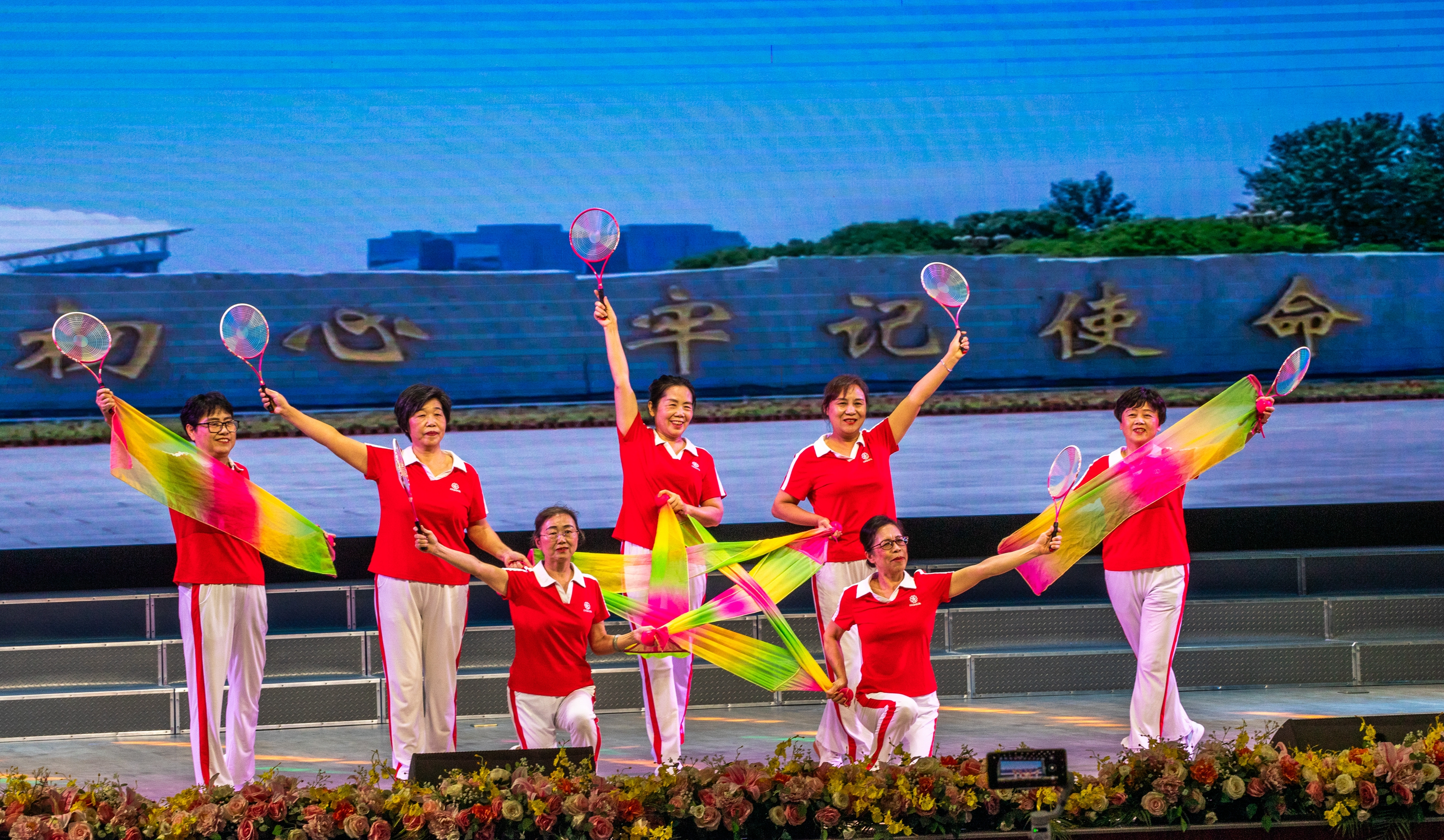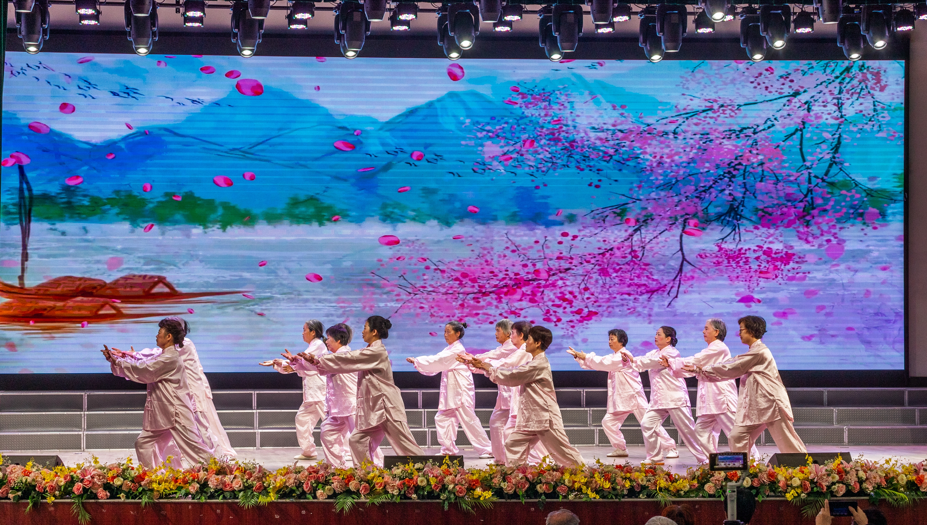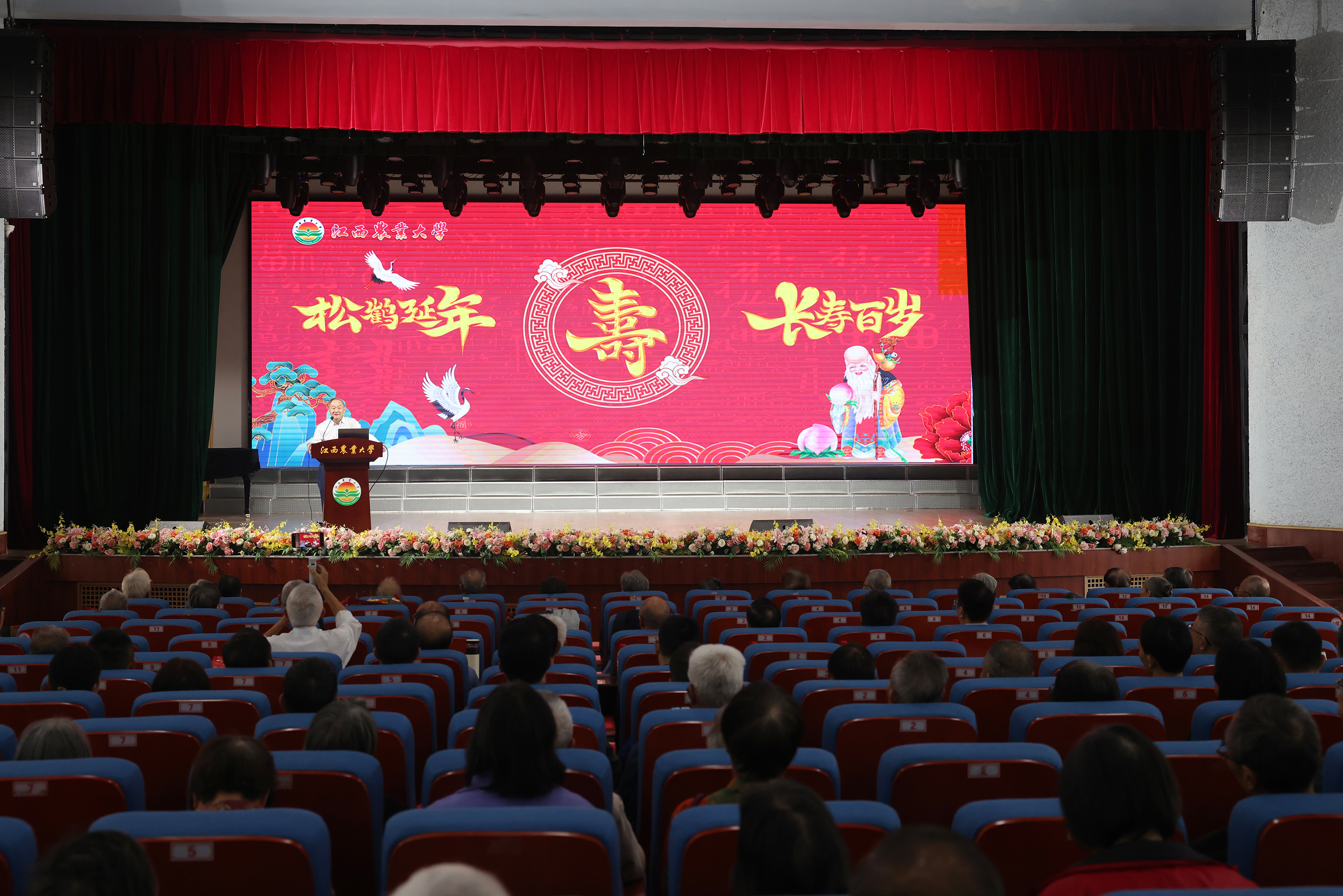 会后,校领导和老寿星们合影留念、共同观看文艺汇演。舞蹈《领航》拉开了文艺演出的序幕,老同志们表演了民族舞、古典舞、柔力球、太极拳、腰鼓舞、大合唱等节目,生动地展示了老同志积极向上的风采,赢得现场的阵阵掌声。