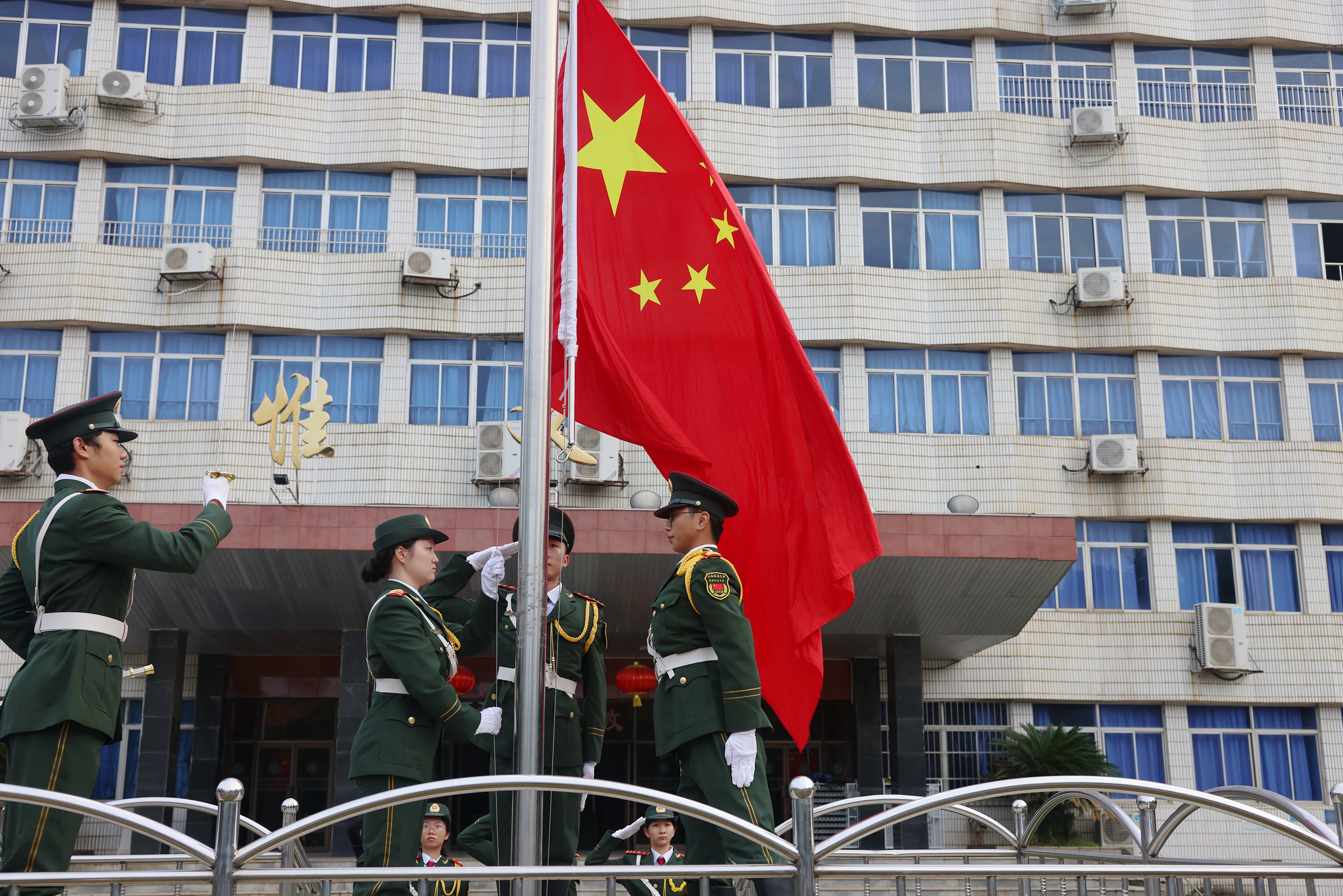 上午7时整,护旗手迈着铿锵有力的步伐,护送五星红旗正步走向升旗台。伴着雄壮的《义勇军进行曲》,全体师生面向国旗肃立致礼,高唱国歌,注视着五星红旗冉冉升起。