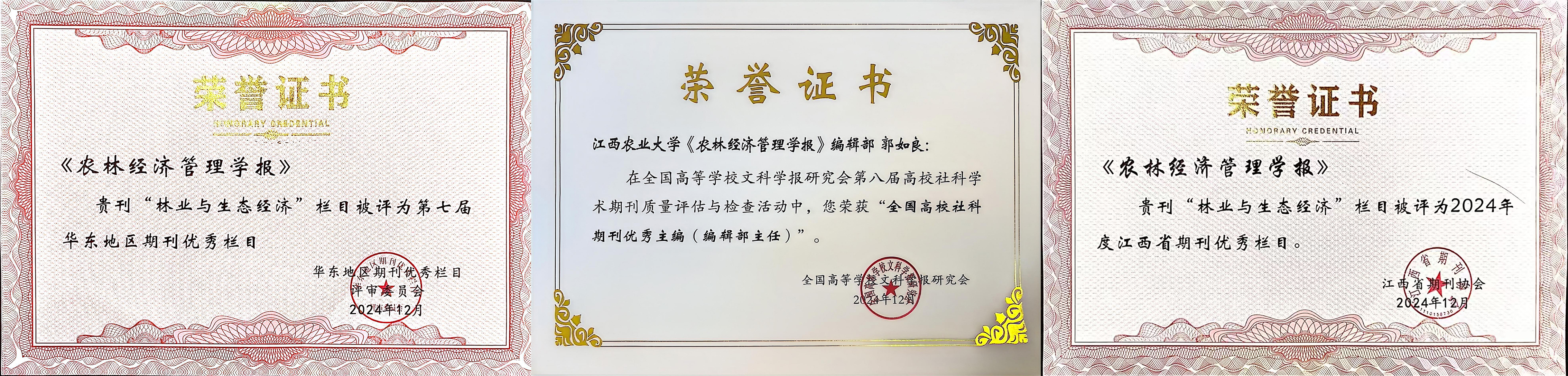 《农林经济管理学报》刊发的3篇论文被人大复印报刊资料《农业经济研究》全文转载,创近8年年转载量新高;加入全国首个哲学社会科学主文献平台、首个哲学社会科学预印本平台——人大哲学社会科学预印本平台;“林业与生态经济”栏目获2024年度江西省期刊“优秀栏目”和第七届华东地区期刊“优秀栏目”;常务副主编郭如良教授荣获“第八届全国高校社科期刊优秀主编(编辑部主任)”。
