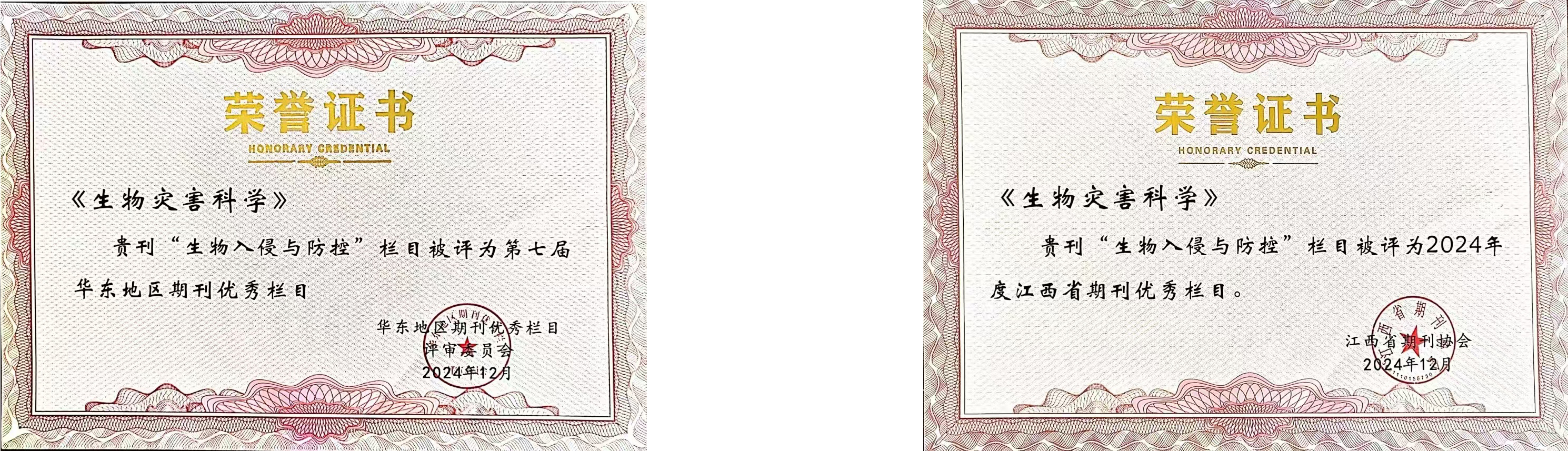 《生物灾害科学》“生物入侵与防控”栏目获2024年度江西省期刊“优秀栏目”和第七届华东地区期刊“优秀栏目”。